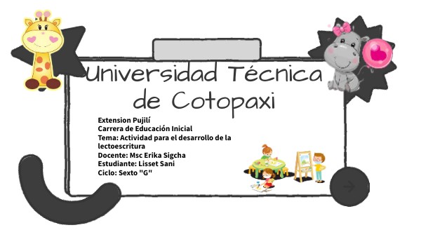 Extension Pujilí Carrera de Educación Inicial Tema: Actividad para el desarrollo de la lectoescritura Docente: Msc Erika Sigcha Estudiante: Lisset Sani Ciclo: Sexto "G"