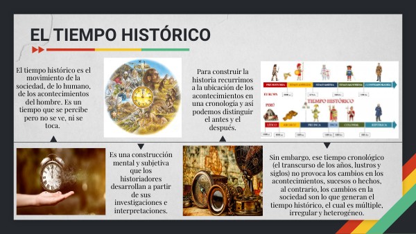 En resumen, para la comprensión del tiempo histórico es necesario saber: Identificar las sucesiones lineales de los hechos o sucesos dentro de las convenciones culturales: antes y después de Cristo, y cronológicas: años, décadas, siglos, milenios. Desarrollar un sentido de simultaneidad, es decir saber correlacionar los hechos o las estructuras dentro de una formación social o de distintas culturas en un mismo tiempo. Distinguir los procesos de cambio y de permanencia dentro de una sociedad. Profundizar en el sentido de la duración y sus ritmos de los procesos históricos.