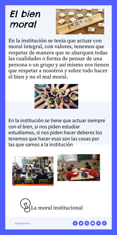 En la institución se tenía que actuar con moral integral, con valores, tenemos que respetar de manera que se abarquen todas las cualidades o forma de pensar de una persona o un grupo y así mismo nos tienen que respetar a nosotros y sobre todo hacer el bien y no el mal moral.