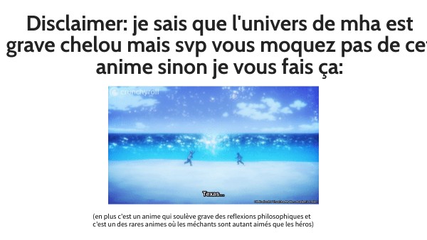 Disclaimer: je sais que l'univers de mha est grave chelou mais svp vous moquez pas de cet anime sinon je vous fais ça: