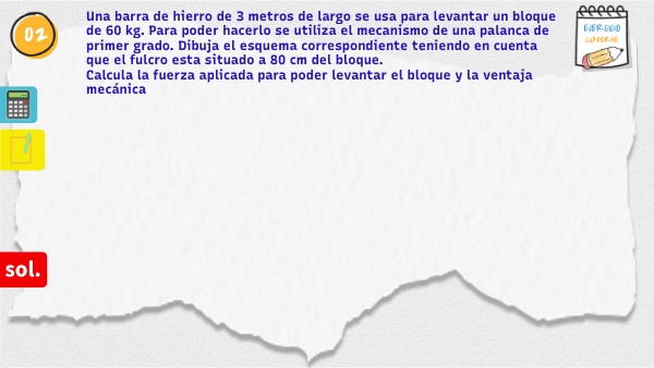Una barra de hierro de 3 metros de largo se usa para levantar un bloque de 60 kg. Para poder hacerlo se utiliza el mecanismo de una palanca de primer grado. Dibuja el esquema correspondiente teniendo en cuenta que el fulcro esta situado a 80 cm del bloque. Calcula la fuerza aplicada para poder levantar el bloque y la ventaja mecánica
