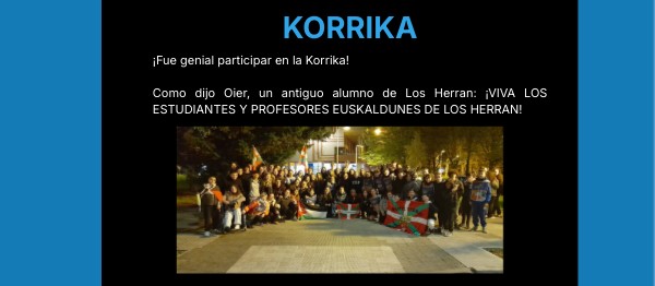 ¡Fue genial participar en la Korrika! Como dijo Oier, un antiguo alumno de Los Herran: ¡VIVA LOS ESTUDIANTES Y PROFESORES EUSKALDUNES DE LOS HERRAN!