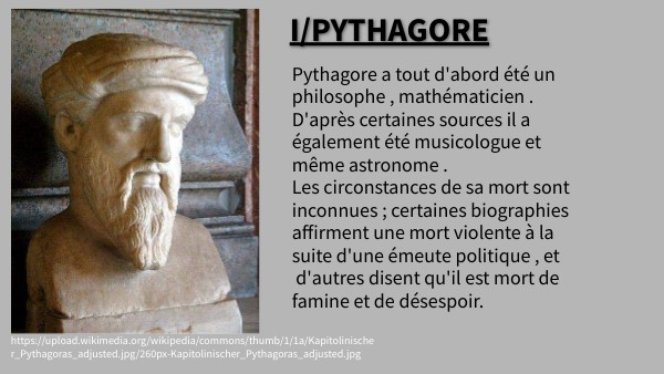 Pythagore était également musicologue , d'après certaines légendes Pythagore aurait posé les bases de la musique . pour Pythagore le musique était comme un acte mathématiques .