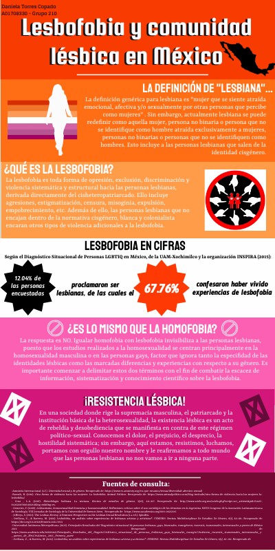 -Amnistía Internacional. (s.f.). Diversidad sexual y de género. Recuperado de: https://www.es.amnesty.org/en-que-estamos/temas/diversidad-afectivo-sexual/-Baruch, R. (2016). Otra forma de violencia hacia las mujeres: La lesbofobia. Animal Político. Recuperado de: https://www.animalpolitico.com/blog-invitado/otra-forma-de-violencia-hacia-las-mujeres-la-lesbofobia/ - Cruz , L.A. (2007). Metodología lesbiana. La ventana. Revista de estudios de género, 3(25), 211-217. Recuperado de: http://www.scielo.org.mx/scielo.php?script=sci_arttext&pid=S1405-94362007000100211&lng=es&tlng=es. - Gemetro, F. (2009). Lesbianismo, homosexualidad femenina y homosexualidad. Reflexiones críticas sobre el uso sociológico de los términos en la Argentina. XXVII Congreso de la Asociación Latinoamericana de Sociología. VIII Jornadas de Sociología de la Universidad de Buenos Aires. Recuperado de: https://www.aacademica.org/000-062/2115 - Jeffreys, S. (1993). The Lesbian Heresy. A Feminist Perspective on the Lesbian Sexual Revolution (1.a ed.). Spinifex. - Orellana, Z.., & Barrera, M. (2021). Lesbofobia, un análisis sobre experiencias de lesbianas artistas y activistas*. FEMERIS: Revista Multidisciplinar De Estudios De Género, 6(1), 82-101. Recuperado de: https://doi.org/10.20318/femeris.2021.5933 -Universidad Autónoma Metropolitana. (2015). Principales Resultados del Diagnóstico situacional de personas lesbianas, gays, bisexuales, transgénero, travestis, transexuales, intersexuales y queers de México 2015. Recuperado de: https://www.academia.edu/18890248/Principales_Resultados_del_Diagn%C3%B3stico_situacional_de_personas_lesbianas_gays_bisexuales_transg%C3%A9nero_travestis_transexuales_intersexuales_y_queers_de_M%C3%A9xico_2015_Primera_parte - Orellana, Z.., & Barrera, M. (2021). Lesbofobia, un análisis sobre experiencias de lesbianas artistas y activistas*. FEMERIS: Revista Multidisciplinar De Estudios De Género, 6(1), 82-101. Recuperado de: