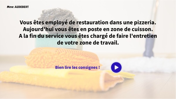 Vous êtes employé de restauration dans une pizzeria. Aujourd'hui vous êtes en poste en zone de cuisson. A la fin du service vous êtes chargé de faire l'entretien de votre zone de travail.