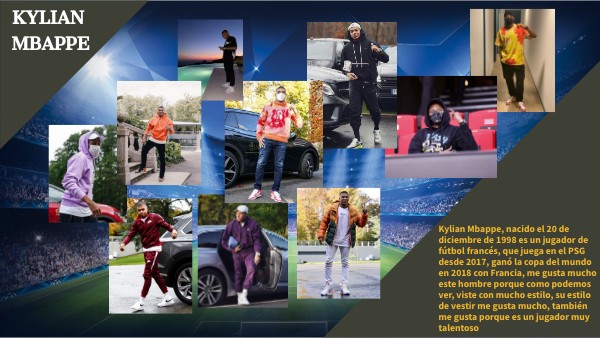 Kylian Mbappe, nacido el 20 de diciembre de 1998 es un jugador de fútbol francés, que juega en el PSG desde 2017, ganó la copa del mundo en 2018 con Francia, me gusta mucho este hombre porque como podemos ver, viste con mucho estilo, su estilo de vestir me gusta mucho, también me gusta porque es un jugador muy talentoso