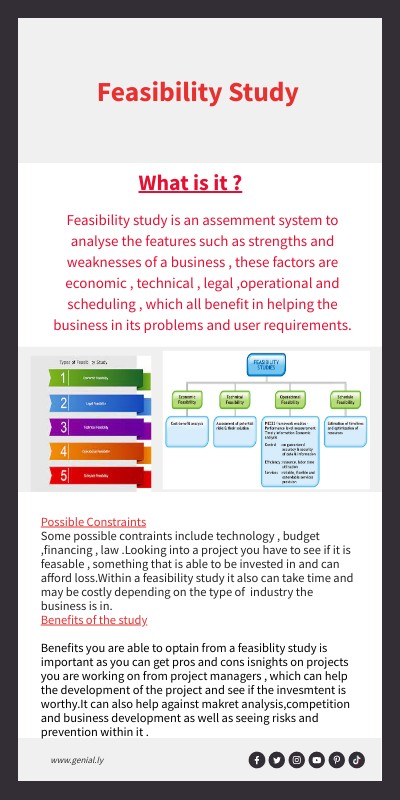 Possible Constraints Some possible contraints include technology , budget ,financing , law .Looking into a project you have to see if it is feasable , something that is able to be invested in and can afford loss.Within a feasibility study it also can take time and may be costly depending on the type of industry the business is in. Benefits of the study Benefits you are able to optain from a feasiblity study is important as you can get pros and cons isnights on projects you are working on from project managers , which can help the development of the project and see if the invesmtent is worthy.It can also help against makret analysis,competition and business development as well as seeing risks and prevention within it .