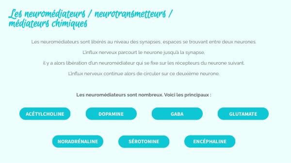 Les neuromédiateurs sont libérés au niveau des synapses, espaces se trouvant entre deux neurones. L’influx nerveux parcourt le neurone jusqu’à la synapse, il y a alors libération d’un neuromédiateur qui se fixe sur les récepteurs du neurone suivant. L’influx nerveux continue alors de circuler sur ce deuxième neurone. Les neuromédiateurs sont nombreux. Voici les principaux :