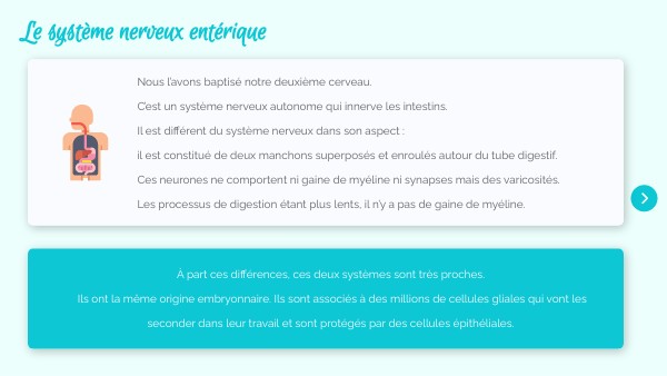 Nous l’avons baptisé notre deuxième cerveau. C’est un système nerveux autonome qui innerve les intestins. Il est différent du système nerveux dans son aspect : il est constitué de deux manchons superposés et enroulés autour du tube digestif. Ces neurones ne comportent ni gaine de myéline ni synapses mais des varicosités. Les processus de digestion étant plus lents, il n’y a pas de gaine de myéline.
