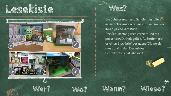 Die Schülerinnen und Schüler gestalten einen Schuhkarton passend zu einem von ihnen gelesenem Buch. Der Schukartong wird verziert und mit passenden Ihnhalt gefüllt. Außerdem gibt es einen Steckbrief der ausgefüllt werden muss und in den Deckel des Schuhkartons geklebt wird.