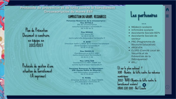 Personnes Ressources de la circonscription : Mme BOTSULA IEN de circonscriptionnatacha.botsula@ac-normandie.fr06 14 85 49 13Mme RENAUXCPC Havre EST 02 35 22 22 23marie-gabrielle.delaune@ac-normandie.frM. BOISDirecteur Varlin 2, ERUN de la mission harcèlementolivier.bois@ac-normandie.fr02 35 47 87 50Mme MASSELINCoordonnatrice ULIS P. BERTmarie.masselin@ac-normandie.fr02 35 47 11 35Mme LEPELTIERCoordonnatrice REP+ HAVRE ESTaurelie.lepeltier@ac-normandie.fr Personnes Resources du Département : EMS (Equipe Mobile de Sécurité) : ems-lehavre@ac-normandie.fr 06.75.76.98.68 M. MOREL Directeur Référent 1er degré DSDEN eric.morel@ac-normandie.fr 02 32 08 99 41