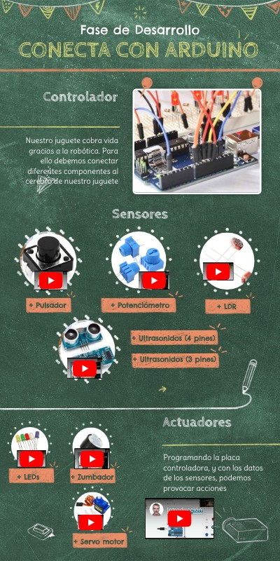 Nuestro juguete cobra vida gracias a la robótica. Para ello debemos conectar diferentes componentes al cerebro de nuestro juguete