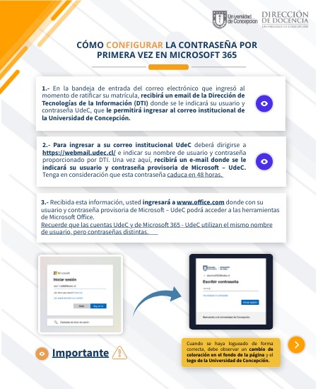 2.- Para ingresar a su correo institucional UdeC deberá dirigirse a https://webmail.udec.cl/ e indicar su nombre de usuario y contraseña proporcionado por DTI. Una vez aquí, recibirá un e-mail donde se le indicará su usuario y contraseña provisoria de Microsoft – UdeC. Tenga en consideración que esta contraseña caduca en 48 horas.
