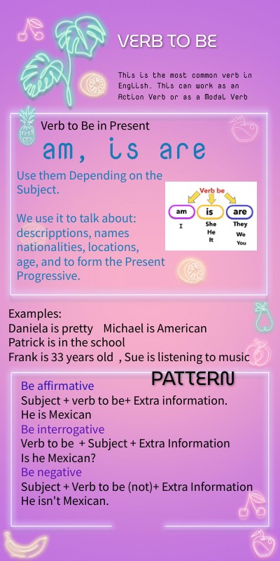 Be affirmative Subject + verb to be+ Extra information. He is Mexican Be interrogative Verb to be + Subject + Extra Information Is he Mexican? Be negative Subject + Verb to be (not)+ Extra Information He isn't Mexican.