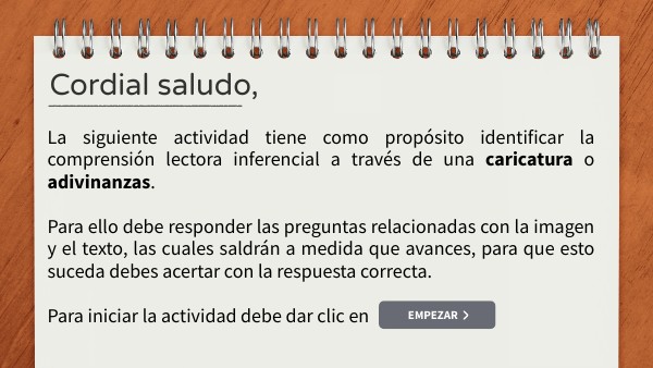 La siguiente actividad tiene como propósito identificar la comprensión lectora inferencial a través de una caricatura o adivinanzas.Para ello debe responder las preguntas relacionadas con la imagen y el texto, las cuales saldrán a medida que avances, para que esto suceda debes acertar con la respuesta correcta. Para iniciar la actividad debe dar clic en