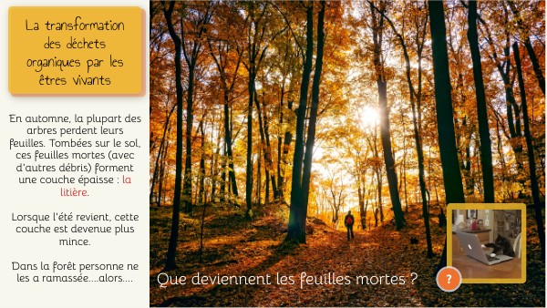 En automne, la plupart des arbres perdent leurs feuilles. Tombées sur le sol, ces feuilles mortes (avec d'autres débris) forment une couche épaisse : la litière. Lorsque l'été revient, cette couche est devenue plus mince. Dans la forêt personne ne les a ramassée....alors....