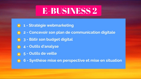 1 - Stratégie webmarketing 2 - Concevoir son plan de communication digitale 3 - Bâtir son budget digital 4 - Outils d'analyse 5 - Outils de veille 6 - Synthèse mise en perspective et mise en situation