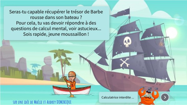 Seras-tu capable récupérer le trésor de Barbe rousse dans son bateau ? Pour cela, tu vas devoir répondre à des questions de calcul mental, voir astucieux... Sois rapide, jeune moussaillon !
