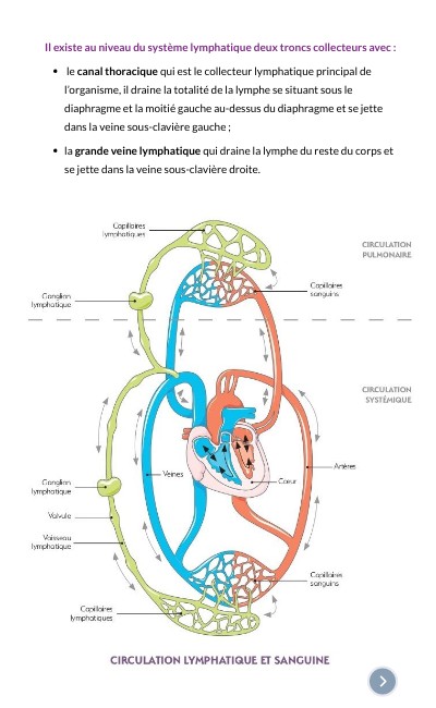 - le canal thoracique qui est le collecteur lymphatique principal de l’organisme, il draine la totalité de la lymphe se situant sous le diaphragme et la moitié gauche au-dessus du diaphragme et se jette dans la veine sous-clavière gauche ;