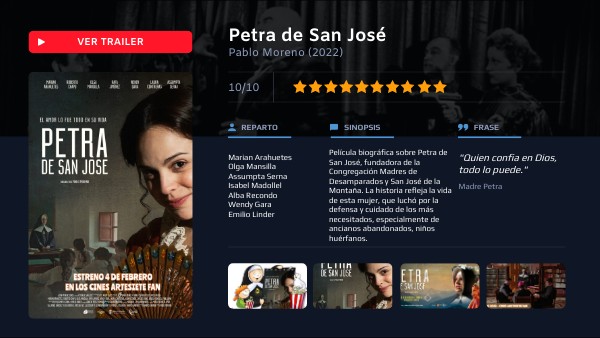 Película biográfica sobre Petra de San José, fundadora de la Congregación Madres de Desamparados y San José de la Montaña. La historia refleja la vida de esta mujer, que luchó por la defensa y cuidado de los más necesitados, especialmente de ancianos abandonados, niños huérfanos.
