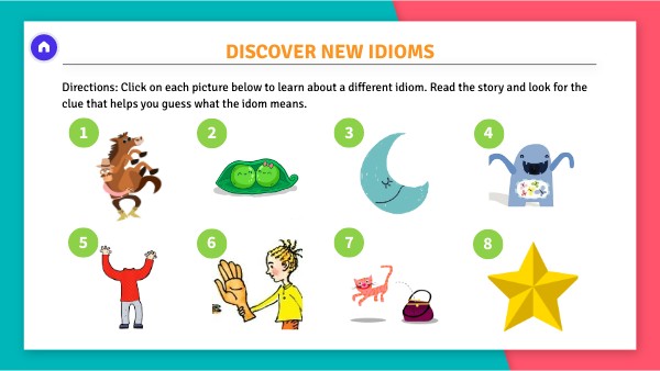 Directions: Click on each picture below to learn about a different idiom. Read the story and look for the clue that helps you guess what the idom means.