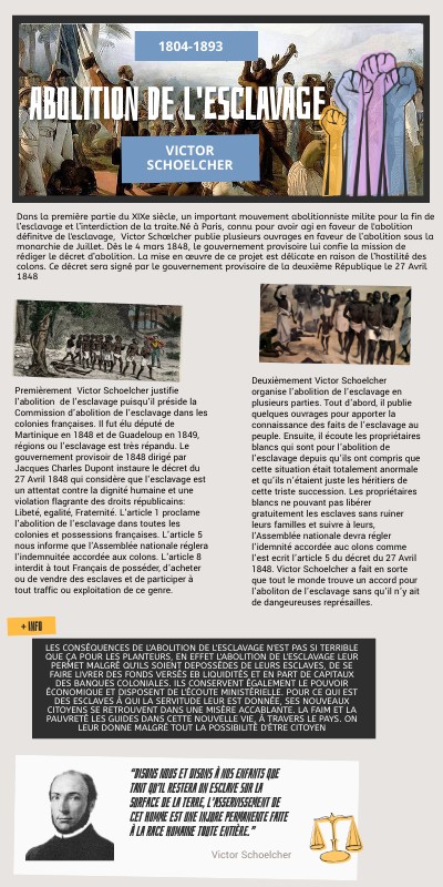 Premièrement Victor Schoelcher justifie l'abolition de l'esclavage puisqu'il préside la Commission d'abolition de l'esclavage dans les colonies françaises. Il fut élu député de Martinique en 1848 et de Guadeloup en 1849, régions ou l'esclavage est très répandu. Le gouvernement provisoir de 1848 dirigé par Jacques Charles Dupont instaure le décret du 27 Avril 1848 qui considère que l'esclavage est un attentat contre la dignité humaine et une violation flagrante des droits républicains: Libeté, egalité, Fraternité. L'article 1 proclame l'abolition de l'esclavage dans toutes les colonies et possessions françaises. L'article 5 nous informe que l'Assemblée nationale réglera l'indemnuitée accordée aux colons. L'article 8 interdit à tout Français de posséder, d'acheter ou de vendre des esclaves et de participer à tout traffic ou exploitation de ce genre.