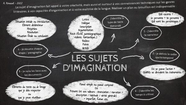 Le sujet d’imagination fait appel à votre créativité, mais aussi et surtout à vos connaissances techniques sur les genres littéraires, à vos capacités d’organisation et à votre maîtrise de la langue. Réaliser un plan au brouillon est indispensable :