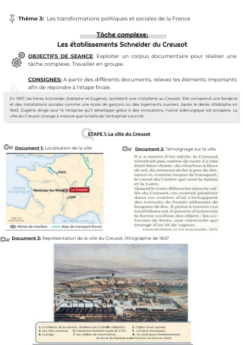 QUESTIONS: Etape 1: La ville 1. Localisez précisément la ville du Creusot. 2. Montrez que la ville du Creusot connaît une intense activité sidérurgique. 3. Décrivez l'organisation de la ville et montrez qu'elle illustre bien l'industrialisation du XIXe. Etape 2: La famille Schneider 1. Pourquoi la famille Schneider est-elle emblématique du Creusot? 2. Où résident-ils? A quelle classe sociale appartiennent-ils? 3. Quelle est la double fonction exercée par la famille au Creusot? Etape 3: L'entreprise 1. Quelle activité trouvait-on au Creusot avant l'installation des Schneider? 2. Quel type d'industrie développent les Schneider? Que construisent-ils? Etape 4: Les conditions des ouvriers 1. A quoi voit-on que l'usine Schenider est une entreprise en réussite? 2. Montrez que les conditions de travail son difficiles pour la classe ouvrière. 3. Où sont logés les ouvriers du Creusot? Grâce à qui? Pourquoi cette faveur? 4. Quels sont les autres services à disposition des ouvriers? Qui les a mis en place? 5. Définissez la notion de paternalisme. Etape 5: Les contestations 1. Comment est remis en cause le système paternaliste des Schneider? Donnez des exemples. 2. Quel terme résumerait bien les rapports entre les Schneider et leurs ouvriers? Quelles qualités attendent-ils de leurs ouvriers? 3. Comment réagit la famille Schneider face aux contestations? Donnez des exemples.