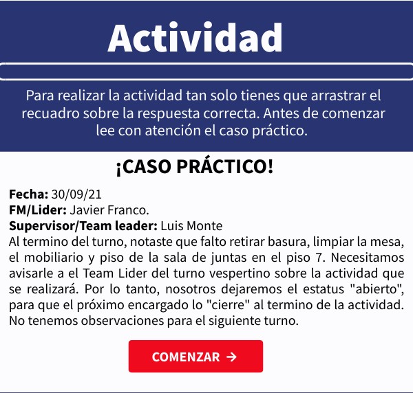 Fecha: 30/09/21 FM/Lider: Javier Franco. Supervisor/Team leader: Luis Monte Al termino del turno, notaste que falto retirar basura, limpiar la mesa, el mobiliario y piso de la sala de juntas en el piso 7. Necesitamos avisarle a el Team Lider del turno vespertino sobre la actividad que se realizará. Por lo tanto, nosotros dejaremos el estatus "abierto", para que el próximo encargado lo "cierre" al termino de la actividad. No tenemos observaciones para el siguiente turno.