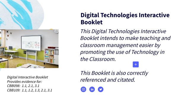This Digital Technologies Interactive Booklet intends to make teaching and classroom management easier by promoting the use of Technology in the Classroom. This Booklet is also correctly referenced and citated.