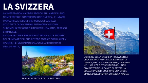 LA SVIZZERA NON HA DEGLI SBOCCHI SUL MARE E IL SUO NOME ESTESO E’ CONFEDERAZIONE ELVETICA . E’ INFATTI UNA CONFEDERAZIONE (REPUBBLICA FEDERALE) COSTITUITA DA 26 CANTONI AUTONOMI CHE SONO SUDDIVISI IN TRE GRUPPI LINGUISTICI: ITALIANO, TEDESCO E FRANCESE. LA SUA CAPITALE E’BERNA CHE SI TROVA SULLE SPONDE DEL FIUME AARE E IL SUO CENTRO STORICO CON I LAUBEN ( PORTICI ) E’ DICHIARATO DALL’UNESCO PATRIMONIO DELL’UMANITA’,