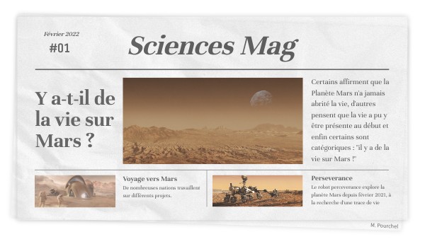Les avis sont différents concernant la présence de la vie sur la planète Mars (voir la première page). Et toi, qu'en penses-tu ? Rédige un texte argumenté à l'aide des informations données dans les pages suivantes et en cours, comme si tu écrivais un article dans un journal, pour indiquer si tu penses que la vie a pu apparaître sur Mars et si elle a pu se maintenir.