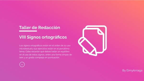 Los signos ortográficos están en el orden de su uso microtextual y sus ejercicios están en el penúltimo tema. Cabe recordar que debes hallar un equilibro en el uso de estos signos, entre una forma simple de leer y un grado complejo en puntuación.