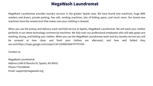 MegaWash Laundromat provides laundry services in the greater Sparks area. We have brand new machines, huge 80lb washers and dryers, private parking, free wifi, vending machines, lots of folding space, and much more. Our brand new machines have the newest tech that makes sure your clothing is cleaned. When you use the pickup and delivery wash and fold service at Sparks, MegaWash Laundromat. We will wash your clothes perfectly in our latest technology commercial machines. We fully train our professional employees who will take great care washing, drying, and folding your clothes. When you use the MegaWash Laundromat wash and dry laundry service you will be amazed at how clean and fresh your clothes are afterward, and how well folded they are.visit:https://maps.google.com/maps?cid=2208853984797767434 Contact us: MegaWash Laundromat Address:1040 El Rancho Dr, Sparks, NV 89431 Phone:7752348544 Email: support@megawash.org