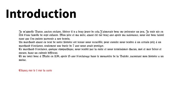 Je m'appelle Vasco, ancien esclave, libérer il y a deux jours de cela.J'aimerais donc me présenter un peu, Je suis née en 1114 d'une famille de sept enfants. Mon père et ma mère, ayant été tué deux ans après ma naissance, nous ont donc laissé sans que l'on puisse parvenir a nos besoin. Un marchand ayant eu vent de notre histoire est venus nous recueillir, pour ensuite nous vendre à un certain prix à un marchand d'esclaves, seulement une durée de 7 ans nous avait protéger. Ce marchand d'esclaves, quoique sympathique, nous vendit par la suite et nous terminâmes chacun, moi et mes frères et soeurs, dans un endroit différent.Et me voici donc à Malte en 1138, après 15 ans d'esclavage dans le monastère de la Valette ,racontant mon histoire a un moine. Cliquez sur le 1 sur la carte