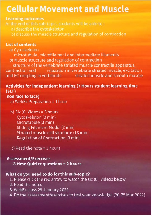 Learning outcomes At the end of this sub-topic, students will be able to : a) describe the cytoskeleton b) discuss the muscle structure and regulation of contraction List of contents a) Cytoskeleton microtubule, microfilament and intermediate filaments b) Muscle structure and regulation of contraction structure of the vertebrate striated muscle contractile apparatus, contraction and relaxation in vertebrate striated muscle, excitation and EC coupling in vertebrate striated muscle and smooth muscle Activities for independent learning (7 Hours student learning time (SLT) non face to face) a) WebEx Preparation = 1 hour b) Six (6) Videos = 3 hours Cytoskeleton (3 min) Microtubule (3 min) Sliding Filament Model (3 min) Striated muscle cell structure (18 min) Regulation of Contraction (3 min) c) Read the note = 1 hours Assessment/Exercises 3-time Quizizz questions = 2 hours What do you need to do for this sub-topic? 1. Please click the red arrow to watch the six (6) videos below 2. Read the notes 3. WebEx class 29 January 2022 4. Do the assessment/exercises to test your knowledge (20-25 Mac 2022)