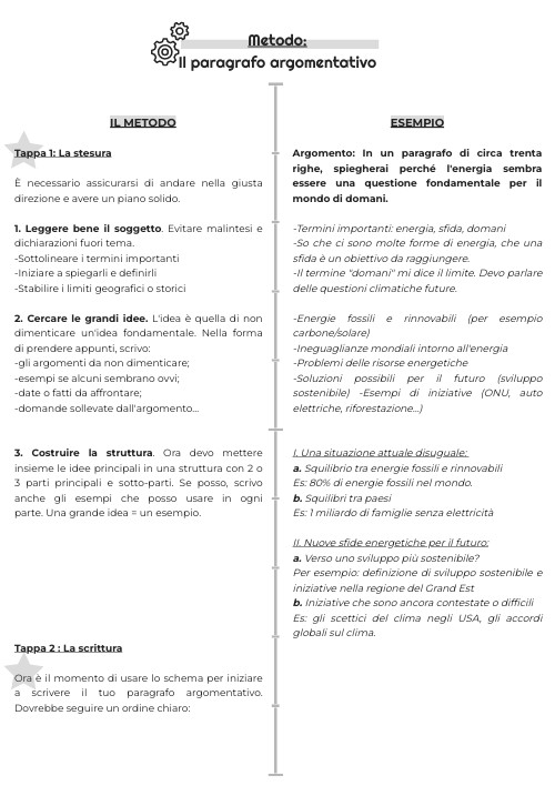 Tappa 1: La stesura È necessario assicurarsi di andare nella giusta direzione e avere un piano solido. 1. Leggere bene il soggetto. Evitare malintesi e dichiarazioni fuori tema. -Sottolineare i termini importanti -Iniziare a spiegarli e definirli -Stabilire i limiti geografici o storici 2. Cercare le grandi idee. L'idea è quella di non dimenticare un'idea fondamentale. Nella forma di prendere appunti, scrivo: -gli argomenti da non dimenticare; -esempi se alcuni sembrano ovvi; -date o fatti da affrontare; -domande sollevate dall'argomento... 3. Costruire la struttura. Ora devo mettere insieme le idee principali in una struttura con 2 o 3 parti principali e sotto-parti. Se posso, scrivo anche gli esempi che posso usare in ogni parte. Una grande idea = un esempio. Tappa 2 : La scrittura Ora è il momento di usare lo schema per iniziare a scrivere il tuo paragrafo argomentativo. Dovrebbe seguire un ordine chiaro: