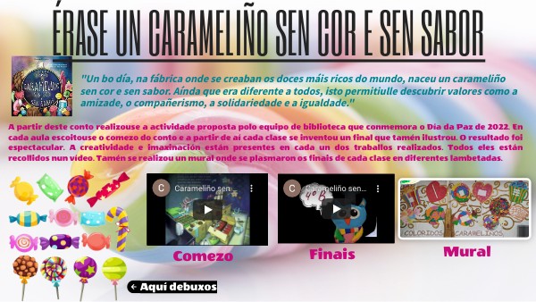 "Un bo día, na fábrica onde se creaban os doces máis ricos do mundo, naceu un carameliño sen cor e sen sabor. Aínda que era diferente a todos, isto permitiulle descubrir valores como a amizade, o compañerismo, a solidariedade e a igualdade."