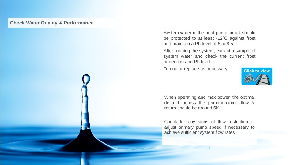System water in the heat pump circuit should be protected to at least -12oC against frost and maintain a Ph level of 6 to 8.5. After running the system, extract a sample of system water and check the current frost protection and Ph level. Top up or replace as necessary.