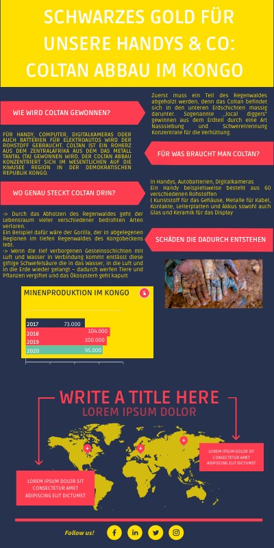 Das Erz Coltan ist grundsätzlich aber wiederverwertbar, heißt wenn jeder seine Handys oder auch Kameras an einer Stelle abgeben würde, könnte man die verschiedenen Metallteile und Coltan wieder für neue Dinge verwenden.