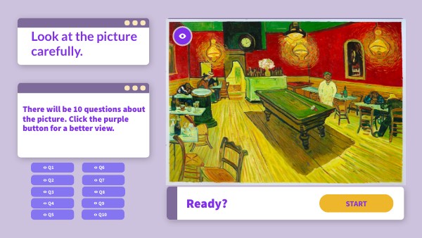 There will be 10 questions about the picture. Click the purple button for a better view.