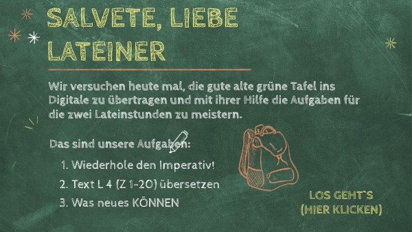 Wir versuchen heute mal, die gute alte grüne Tafel ins Digitale zu übertragen und mit ihrer Hilfe die Aufgaben für die zwei Lateinstunden zu meistern.