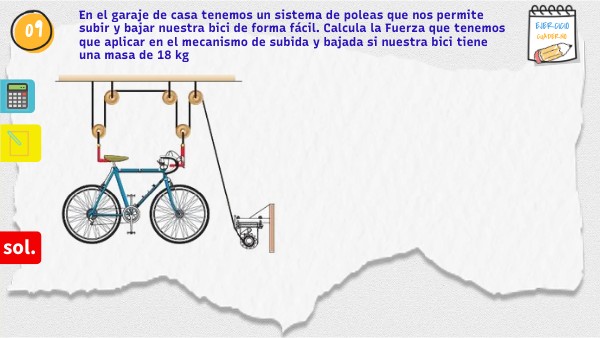 En el garaje de casa tenemos un sistema de poleas que nos permite subir y bajar nuestra bici de forma fácil. Calcula la Fuerza que tenemos que aplicar en el mecanismo de subida y bajada si nuestra bici tiene una masa de 18 kg