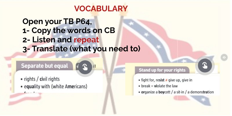 Open your TB P64,1- Copy the words on CB 2- Listen and repeat 3- Translate (what you need to)