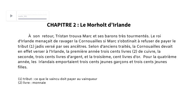 Cette année-là, le roi avait envoyé à Tintagel un impressionnant messager. C’était un chevalier géant, nommé le Morholt. Personne n’avait encore réussi à le vaincre au combat. Il dit au roi : - «Roi Marc, je te le dis pour la dernière fois : le roi d’Irlande, mon seigneur, te réclame le tribut que tu lui dois. Et parce que tu l’as trop fait attendre, il te demande de me livrer en ce jour trois cents jeunes garçons et trois cents jeunes filles de quinze ans. Ma nef (1) les emportera pour qu’ils deviennent nos serfs (2).
