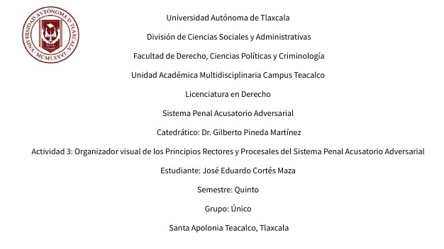 Universidad Autónoma de Tlaxcala División de Ciencias Sociales y Administrativas Facultad de Derecho, Ciencias Políticas y Criminología Unidad Académica Multidisciplinaria Campus Teacalco Licenciatura en Derecho Sistema Penal Acusatorio Adversarial Catedrático: Dr. Gilberto Pineda Martínez Actividad 3: Organizador visual de los Principios Rectores y Procesales del Sistema Penal Acusatorio Adversarial Estudiante: José Eduardo Cortés Maza Semestre: Quinto Grupo: Único Santa Apolonia Teacalco, Tlaxcala