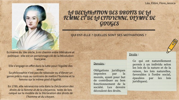 Ecrivaine du 18e siècle, à mi chemin entre littérature et politique : elle est un personnage clé de la Révolution française. Elle s'engage en effet dans la lutte pour l'égalité des sexes. Sa philosophie n'est pas de rabaisser ou d'élever un genre précis mais au contraire de mettre l'homme et la femme sur le même pied d'égalité. En 1789, elle retranscrira cela dans la Déclaration des droits de la femme et de la citoyenne, texte de lois calqué sur le modèle de la Déclaration des droits de l'homme et du citoyen.