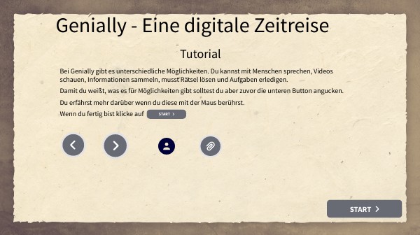Bei Genially gibt es unterschiedliche Möglichkeiten. Du kannst mit Menschen sprechen, Videos schauen, Informationen sammeln, musst Rätsel lösen und Aufgaben erledigen. Damit du weißt, was es für Möglichkeiten gibt solltest du aber zuvor die unteren Button angucken. Du erfährst mehr darüber wenn du diese mit der Maus berührst. Wenn du fertig bist klicke auf