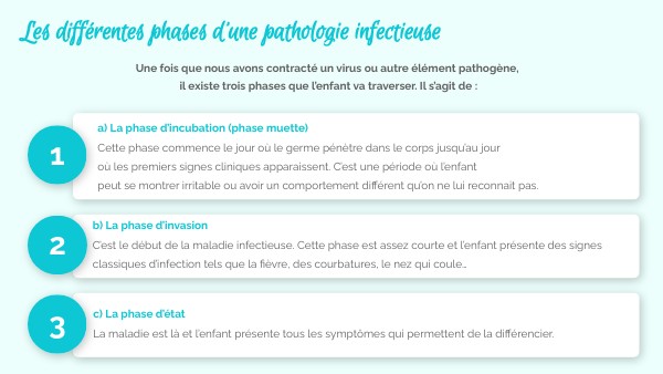 Une fois que nous avons contracté un virus ou autre élément pathogène, il existe trois phases que l’enfant va traverser. Il s’agit de :