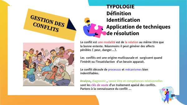 Maîtriser des compétences nécessaires à la gestion des conflits, gérer ses émotions Se familiariser avec les facteurs de risque du conflit Créer les conditions favorisant la coopération Utiliser l'écoute active , la communication positive l'empathie et l'assertivité Maîtriser l'après conflit Utiliser des outils de gestion à voir à la prochaine étape...